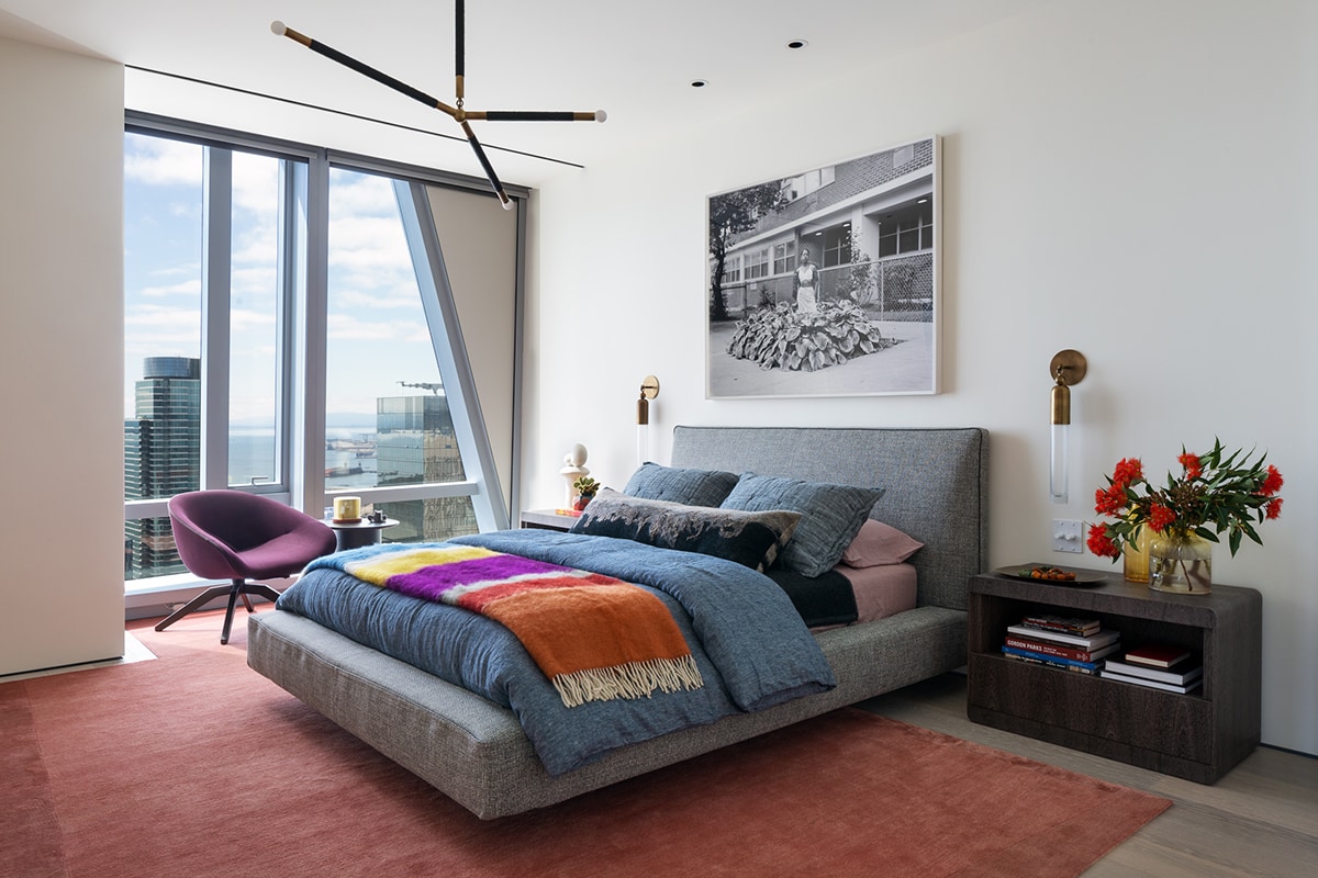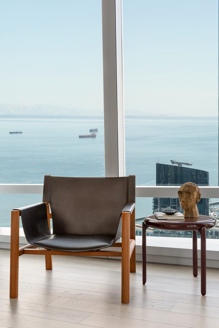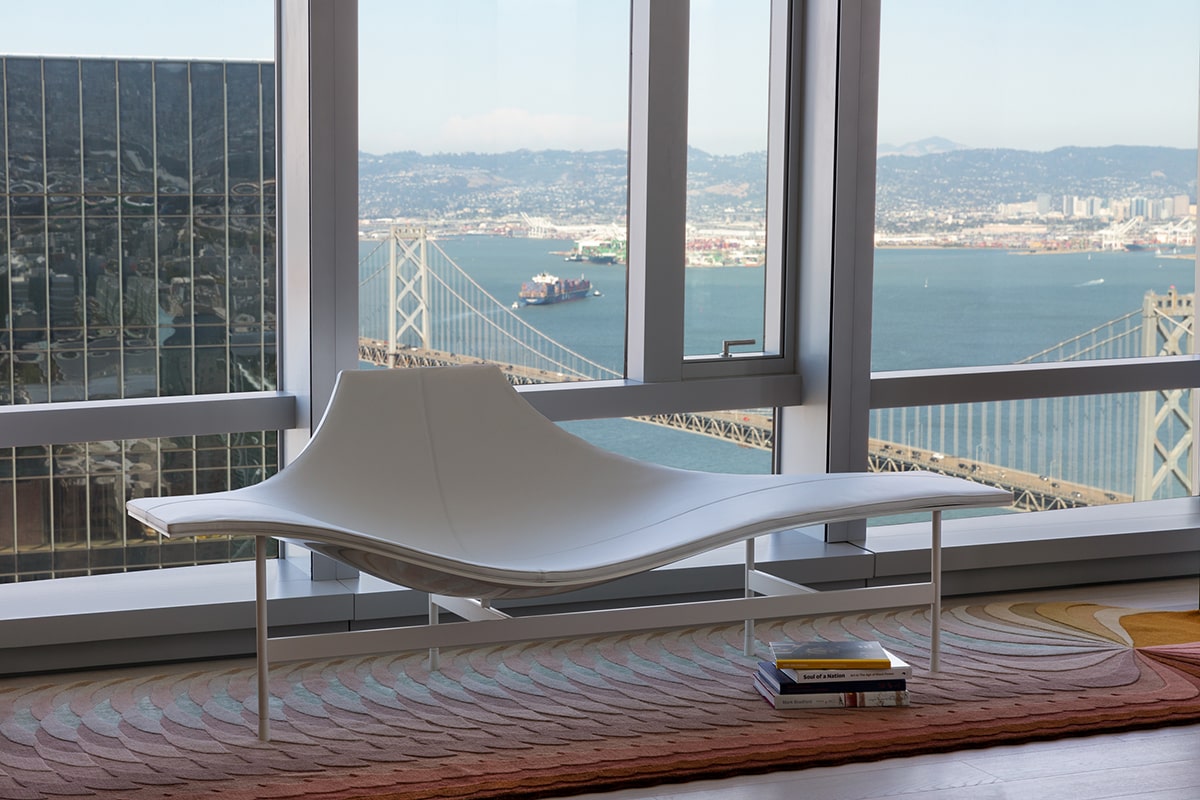 The stunning views from the floor-to-ceiling windows are taken into consideration, too. Case in point: The designers playfully set Jean-Marie Massaud’s Terminal 1 Chaise Longue before a view of the Bay Bridge and its similarly undulating lines.