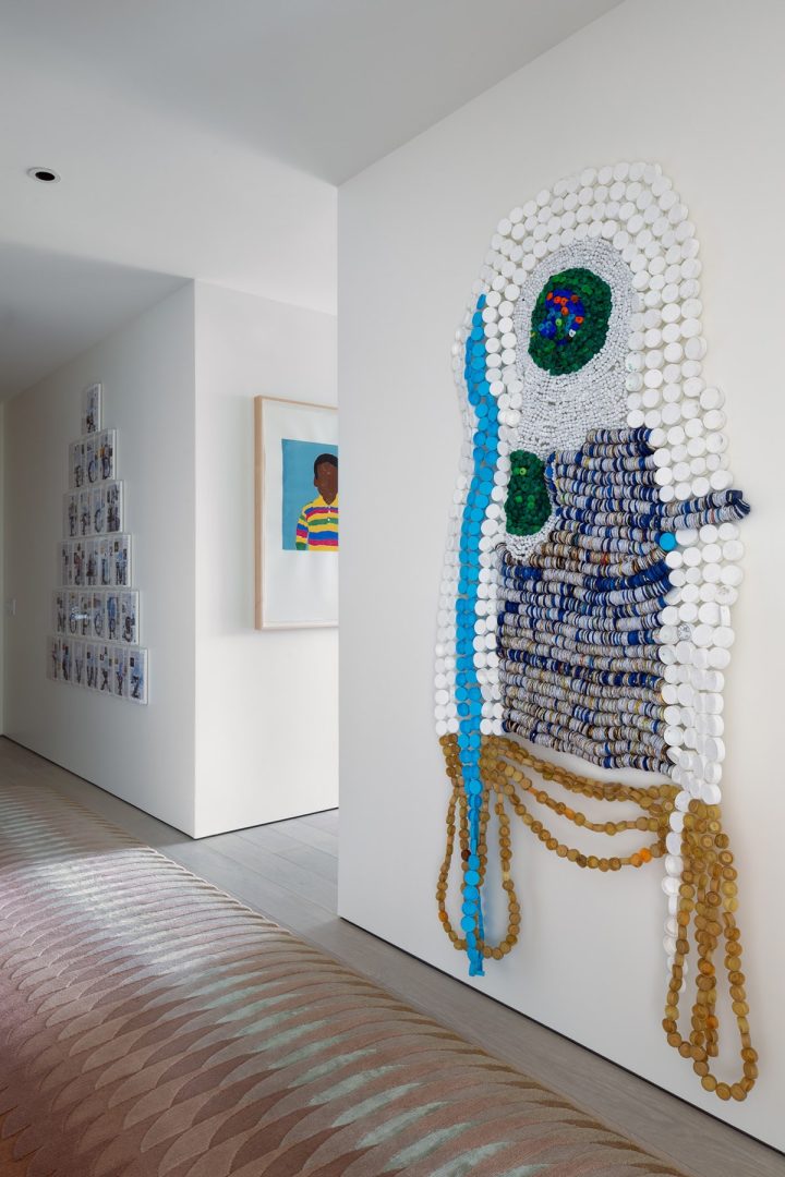 But while the views are commanding, the collection of art is just as much of a conversation starter, particularly at a time when America is healing from its racial divide. A hallway is lined with works by Moffat Takadiwa, Tavares Strachan, and Shaina McCoy, and the focal point in the dining room is a colorful piece by Ghanian artists Serge Attukwei Clottey.