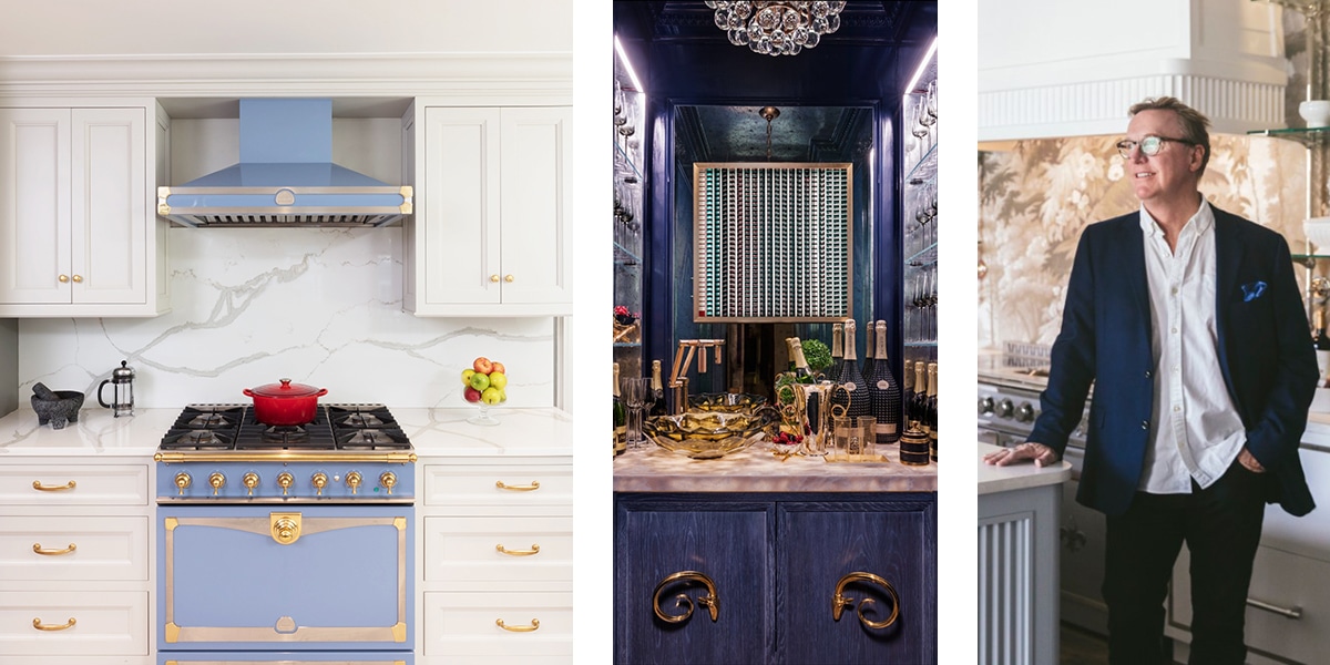 FROM LEFT TO RIGHT: A periwinkle-blue range and glamorous gold hardware bring a “wow” factor to this kitchen; Dove loves Frank Gehry for his “sheer, breathtaking boldness.” He gets a little bold himself with this sapphire backlit bar with oversized gold accents; Jim Dove, in his West Palm Beach showroom.